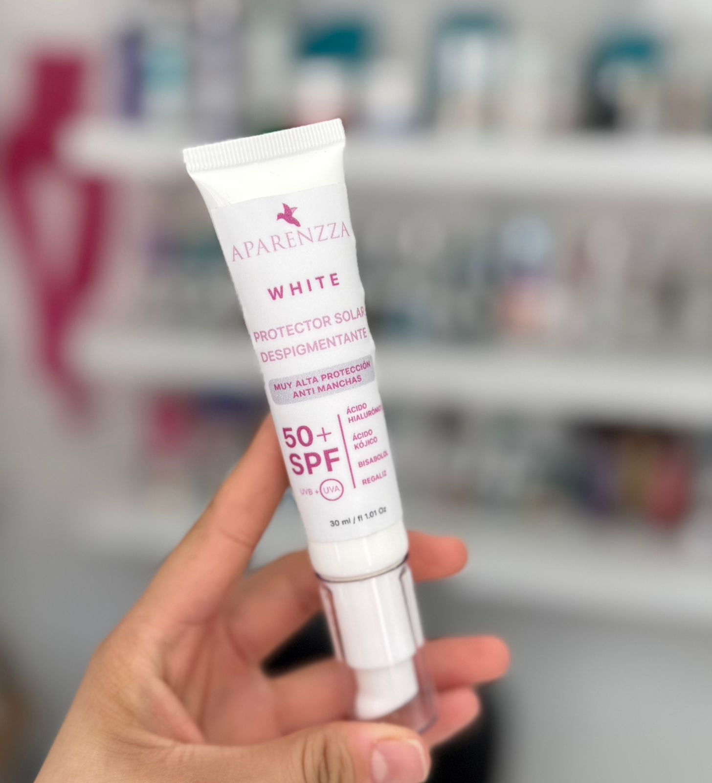 ((FÓRMULA WHITE MOON) Ingredientes activos: FPS 50, ácido hialurónico, Bisabolol, hordenina, acido kojico, arbutina, extracto de regaliz, extracto deextracto de capuchina, sauce blanco, arándano.